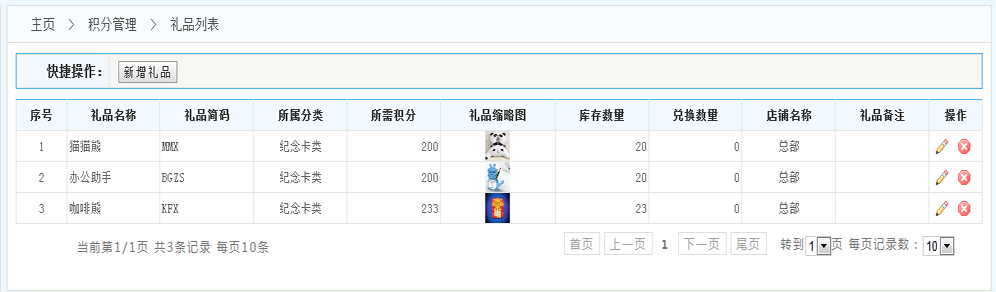 詳細操作:可以對該條的禮品經行修改和刪除!