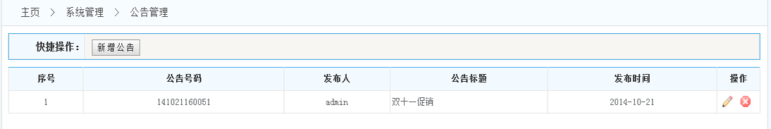 2.公告列表:在公告列表的操作一欄 可以對改公告進行修改和刪除的操作