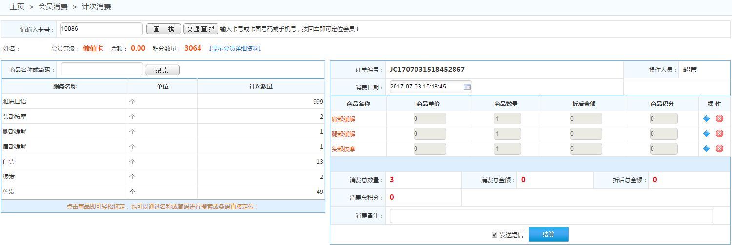 通過刷卡,或者通過查詢定位到會員,然后在左側(cè)選擇服務(wù)類型商品進行計次消費 如下圖: