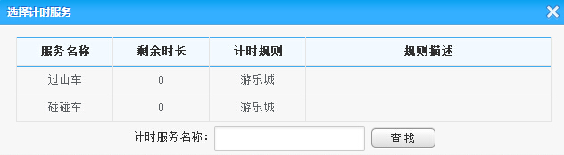 通過刷卡或者是查找定位到會員信息,點擊選擇服務(wù)按鈕將彈出計時服務(wù)列表框,從其中選擇計時服務(wù),輸入預(yù)訂消費時長后(可選)點擊消費開始,便開始計時消費,同時計時消費列表也將添加此條消費記錄,選擇計時服務(wù)對話框如下: